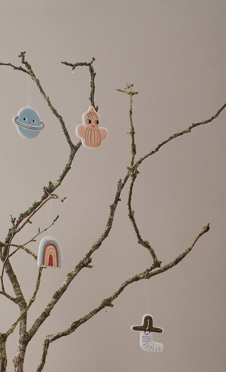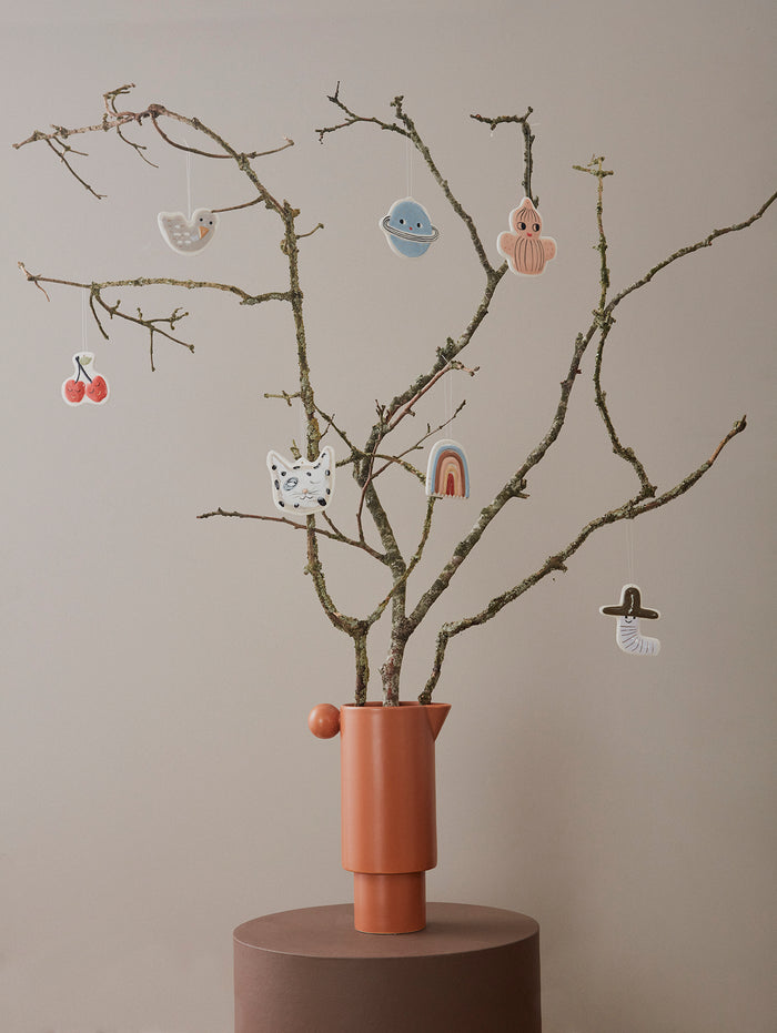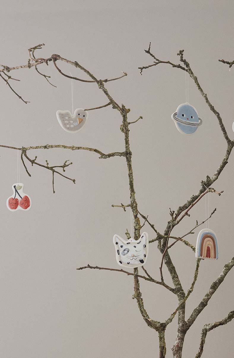 Use these cute and fine porcelain figures as a hanging in the children's room, which at the same time initiates lively and fantastic stories. The figures are a decorative element in the children's room, and have glaze in beautiful Colors. Comes in a set of 7 different figures; the bird Billy, the angel Lucia, the planet Pluto, the cat Zorro, the larva Buster, a cherry and a rainbow.Cord for hanging is included.Style no. M107062 Material: 100% Porcelain Dimensions: H5,5 x W6,3 - H8,2 x W7,7 cm