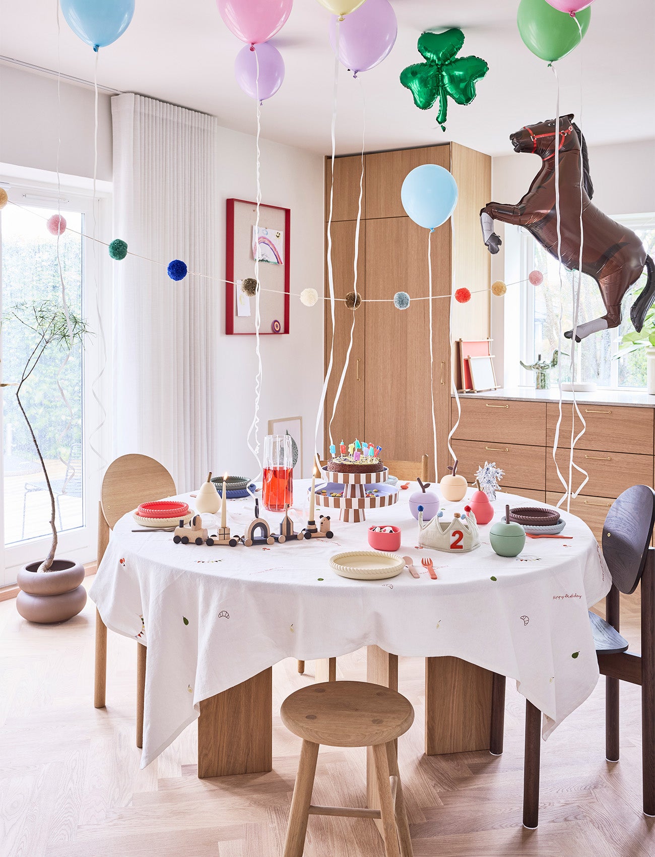 The Birthday Tablecloth is perfect for celebrations and other festive occasions, adding a playful and vibrant touch to your gatherings. It's designed to be used year after year, making it a cherished tradition. Featuring festive illustrations, this tablecloth is made from 100% OEKO-TEX cotton. Care instructions: machine wash at 60 degrees, stretch gently when wet. The tablecloth can be lightly ironed on the reverse side at low heat – possibly with a damp dish towel and steam to smooth out creases. Minimal 3% shrinkage.