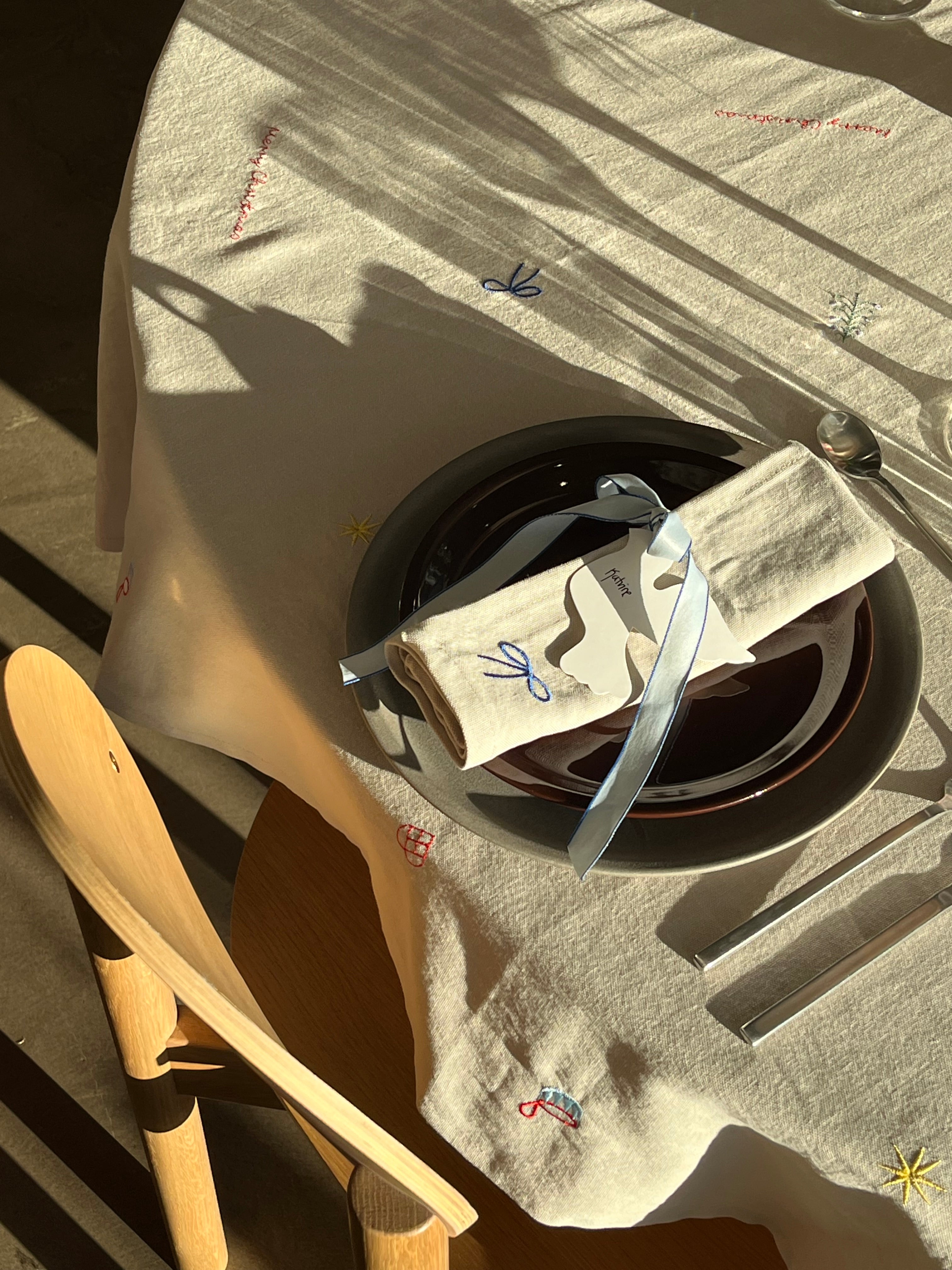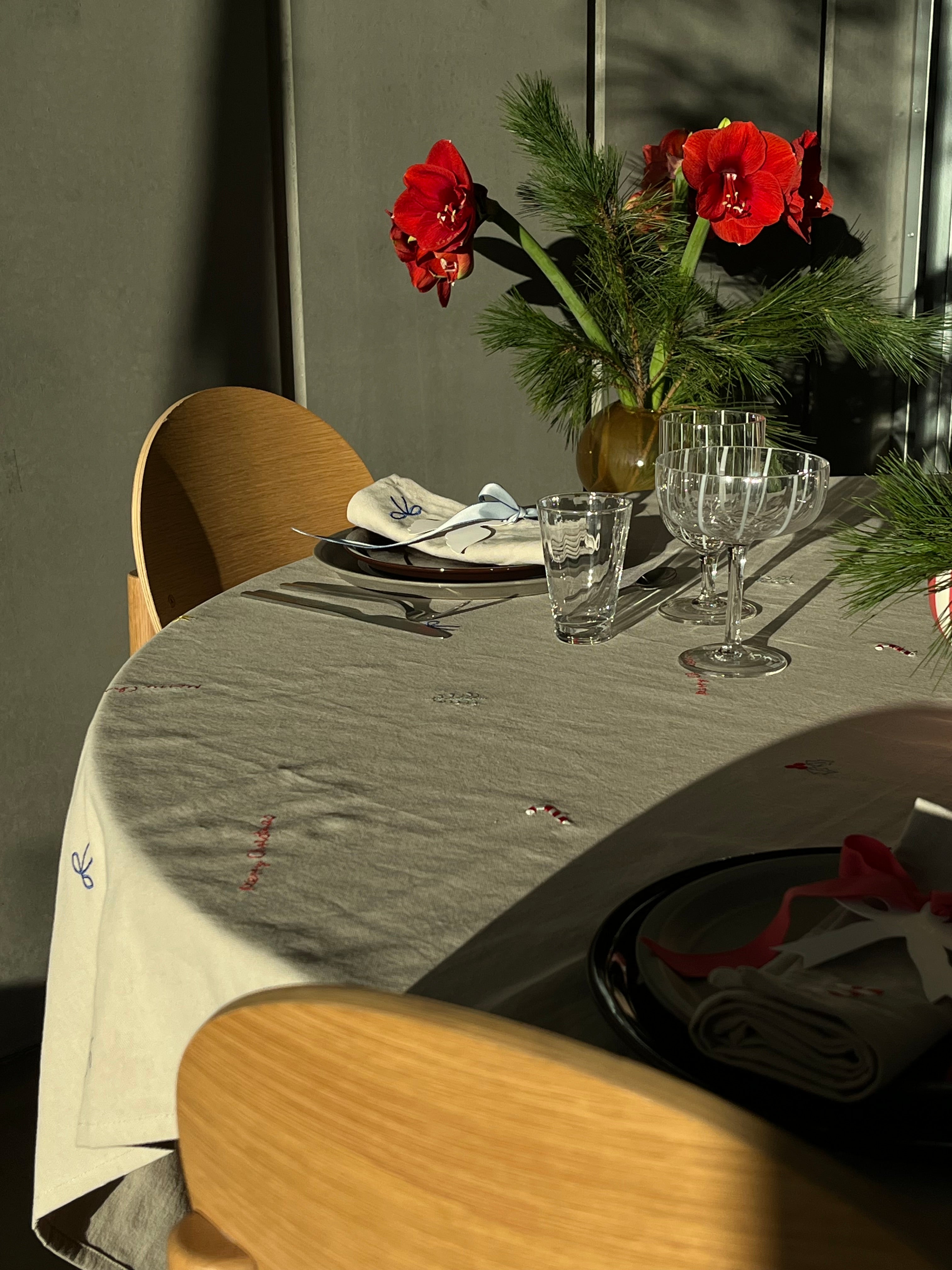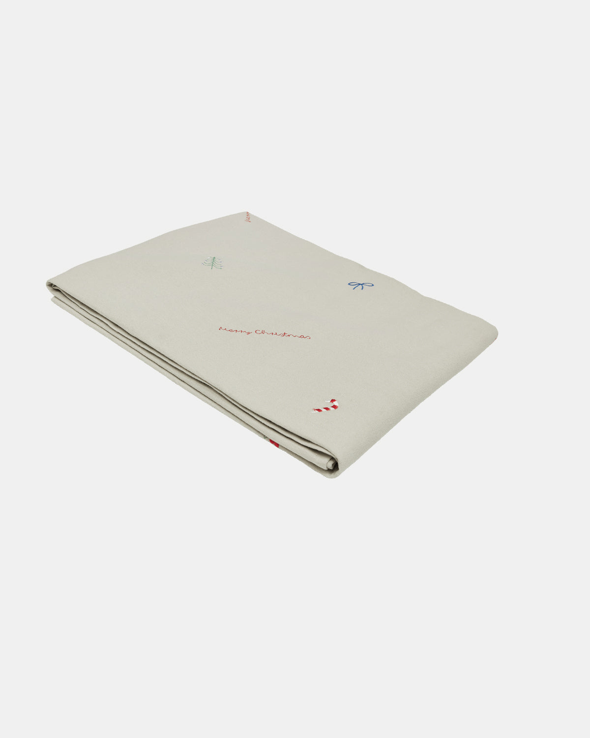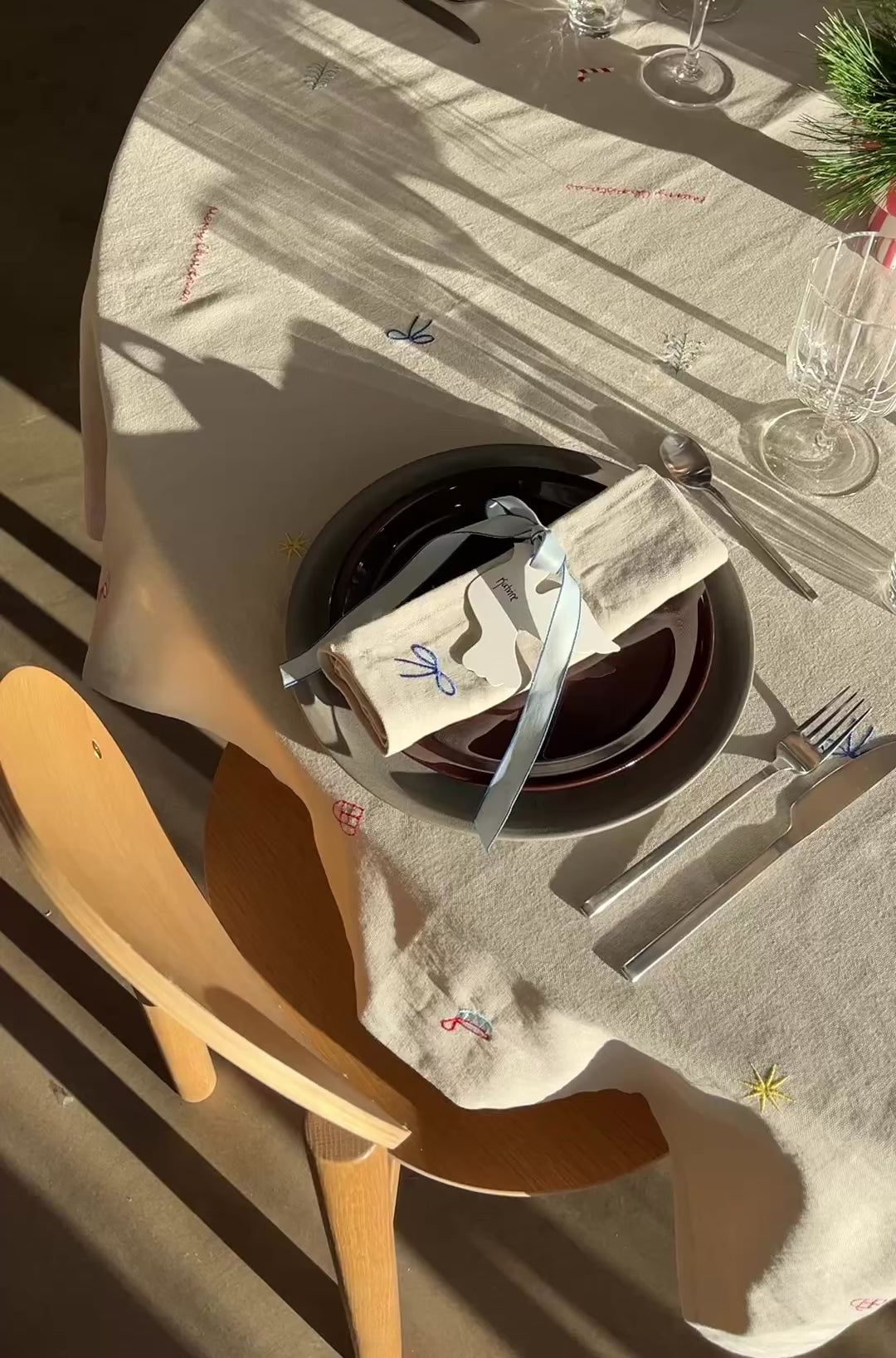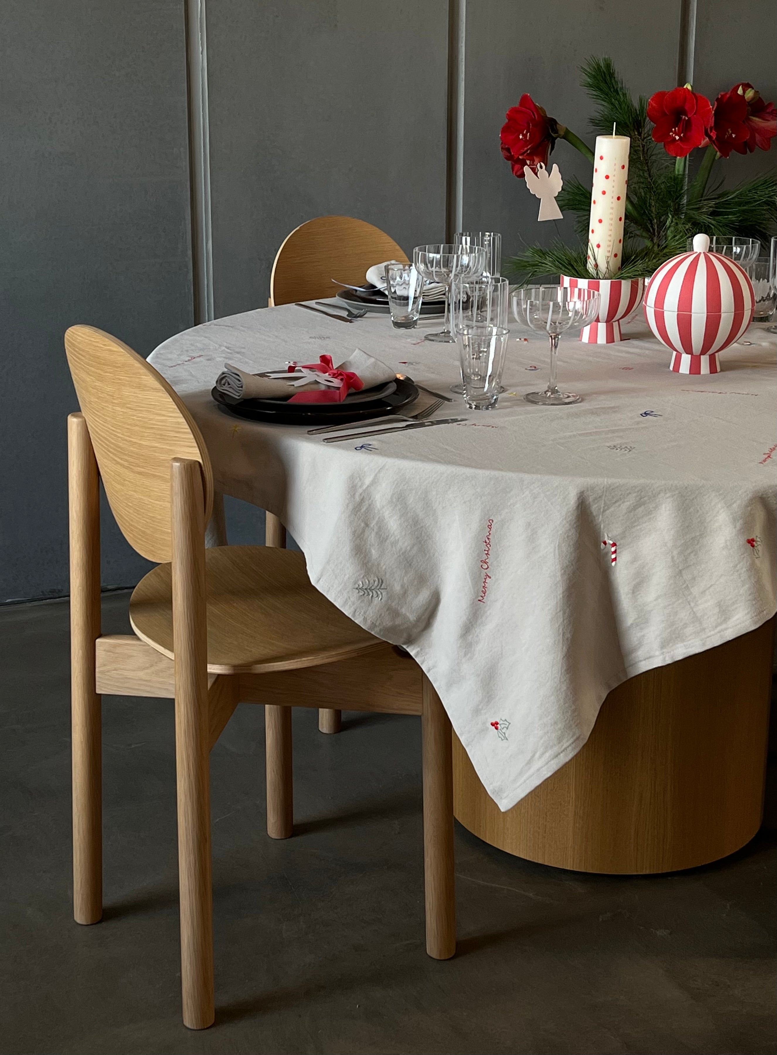 The Christmas tablecloth is adorned with charming holiday illustrations. Elevate your festive table setting with this delightful and practical tablecloth – perfect for adding a playful touch to your Christmas gatherings.