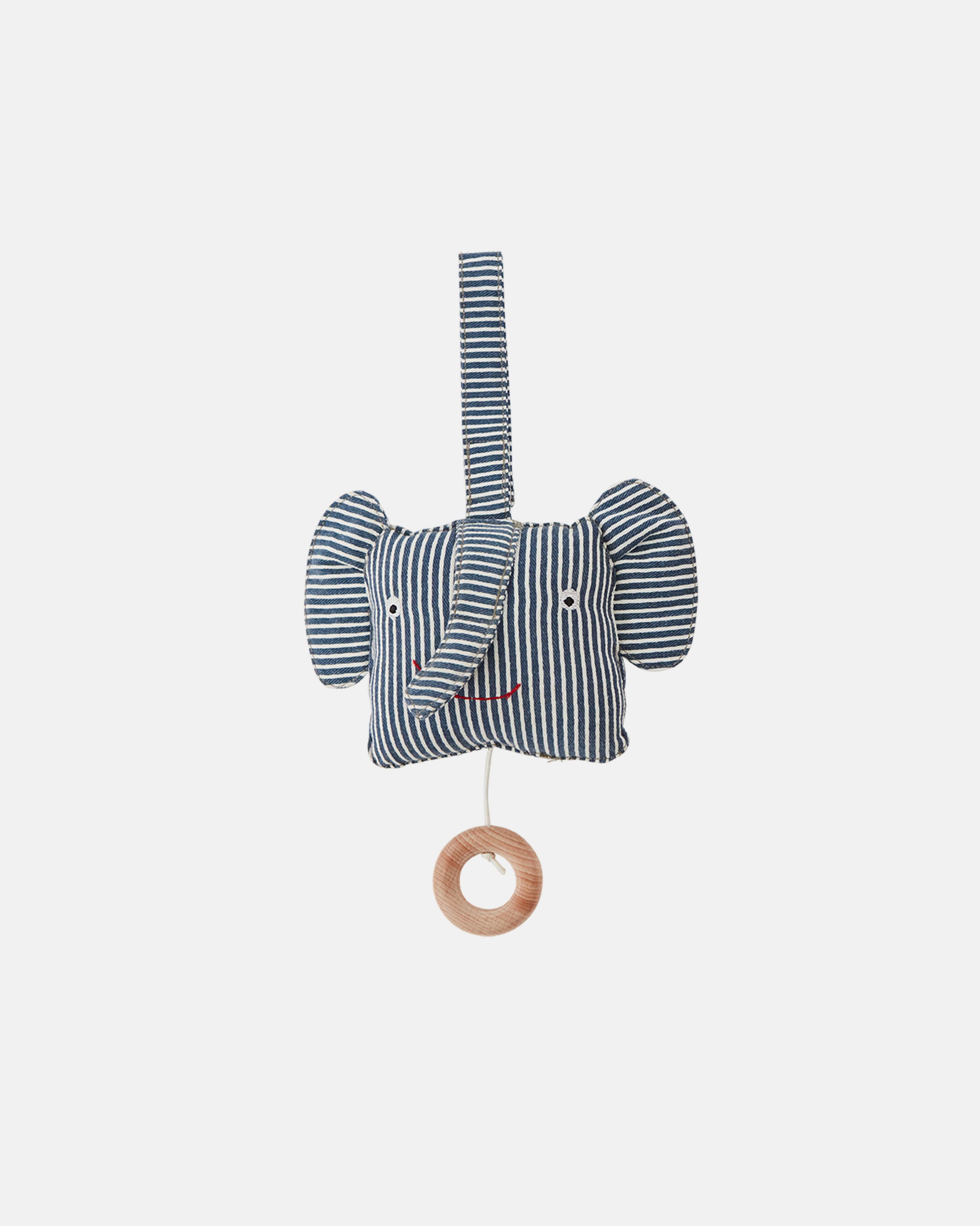 The music mobile with Erik Elephant creates a calming and cozy atmosphere and will surely help your child fall asleep. The calm melody starts when the ring at the bottom is pulled down. The music mobile is made of denim and has a polyester filling.Melody: "Brahms' Lullaby". CE-approved.Note: This product is not a toy.Style no. M107094 Material: 100% Organic Cotton, 100% Polyester Filling Dimensions: H9,5 x L16 x W8 cm