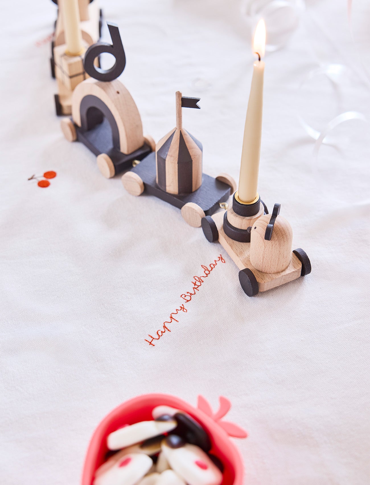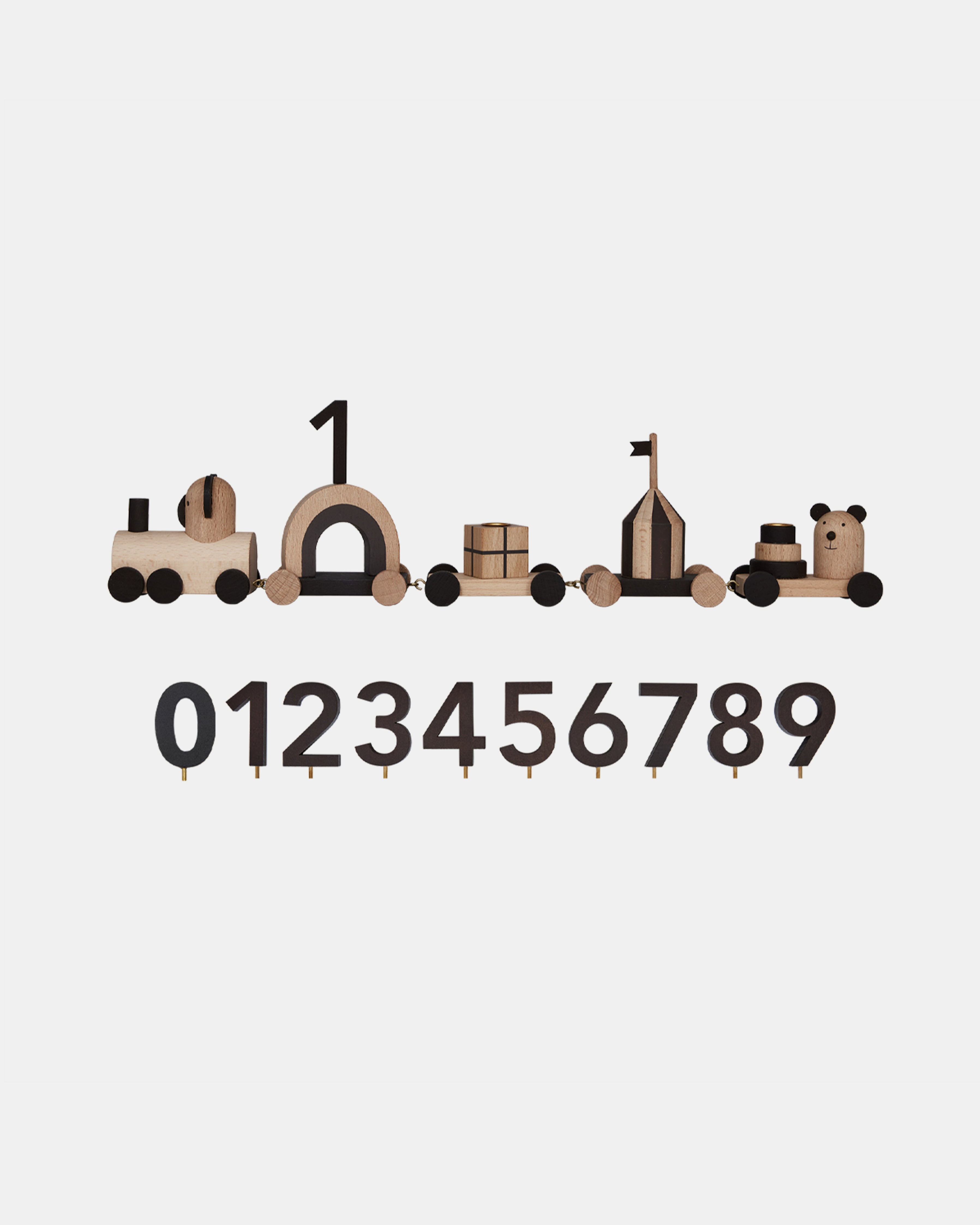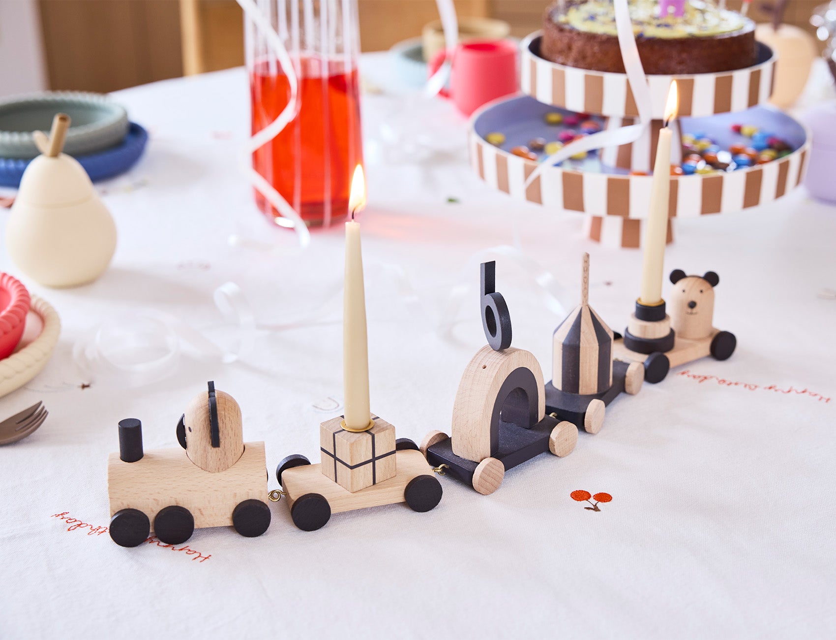 A cute birthday train with numbers and candles to decorate the table for special occasions made of FSC birch wood. The wood is 100% natural Colored birch or stained birch. The Birthday Train contains 1 train, 4 wagons and 10 numbers. All wagons can be attached/detached with small hooks in brass finish.
