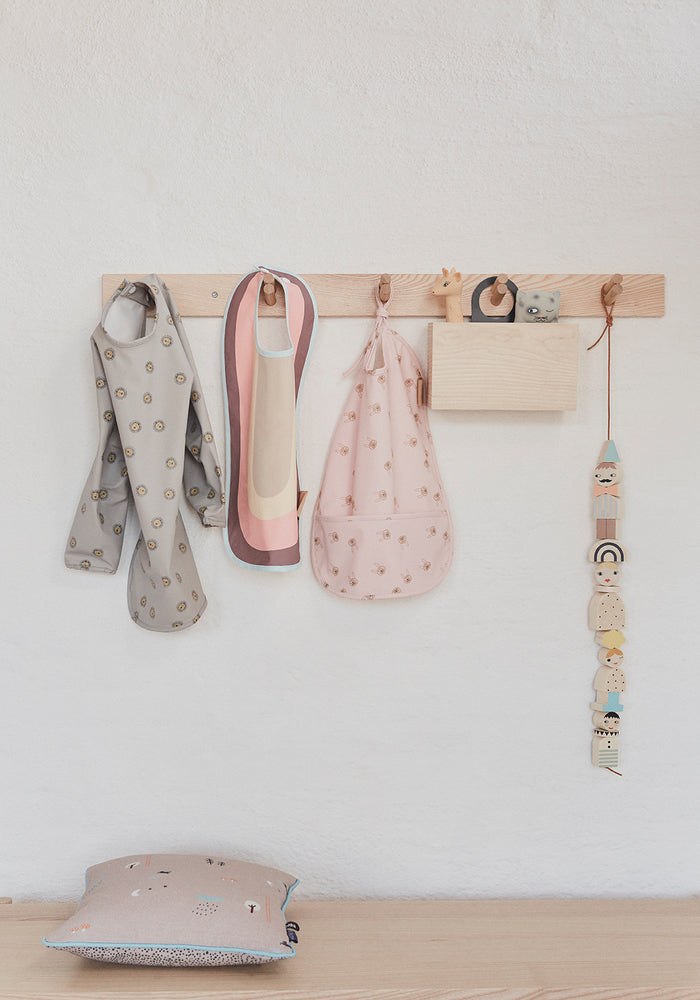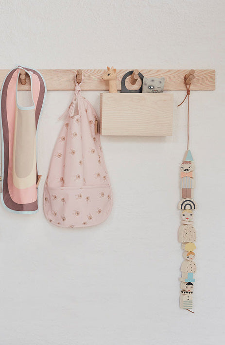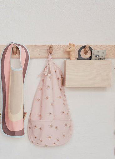 A soft polyester bib with a tieband. The bib is fitted with a pocket that ensures that the excess food does not continue onto the baby's clothing.The bib is made with a cute pattern with eg. rainbows.The bib is made of 100% polyurethane.30° gentle machine wash is recommended.Style no. M1001 Color: Rose Material: 100% Polyester Dimensions: H37 x W27 cm