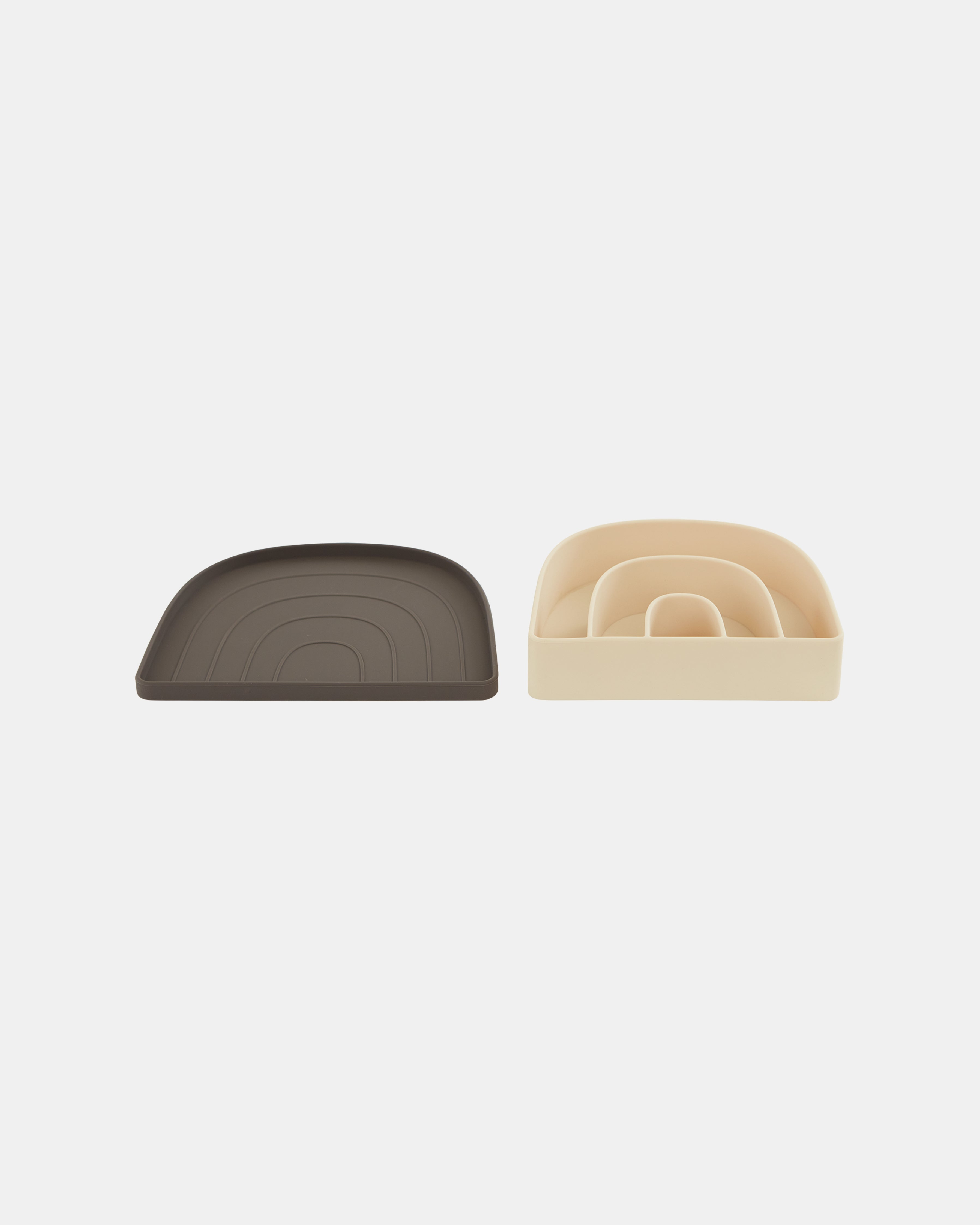 Our Rainbow Plates are made in the recognizable rainbow design. The design is simple and playful at the same time and is available in several Color combinations. The plates are divided into rooms of different sizes.The plates are made of 100% silicone, which is practical and easy to clean. They are food approved, dishwasher and microwave safe.Consists of a set of two psc. Style no. M107097 Color: Choko / Vanilla Material: 100% Silicone Dimensions: H1,2 x L20,5 x W17 cm / H3,3 x L17,5 x W14,5 cm Suitable for dishwasher and microwave. For more information on food contact material and declarations on conformity, please use this link: https://oyoy.presscloud.com/digitalshowroom/#/gallery/Compliance